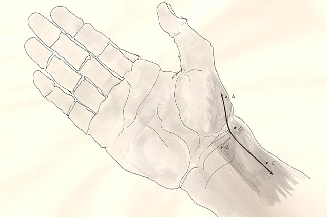 2 - Dissecção anatômica com visualização do feixe vásculo-nervoso da extremidade distal do antebraço e identificação da cápsula articulcar.